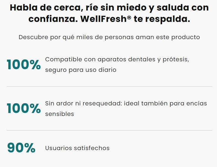 El mal aliento puede afectar tu confianza, tu vida social e incluso tu autoestima. Pero no te preocupes, WellFresh actúa directamente contra las bacterias que causan el mal aliento, asegurando que no solo tengas un aroma fresco, sino también una boca sana